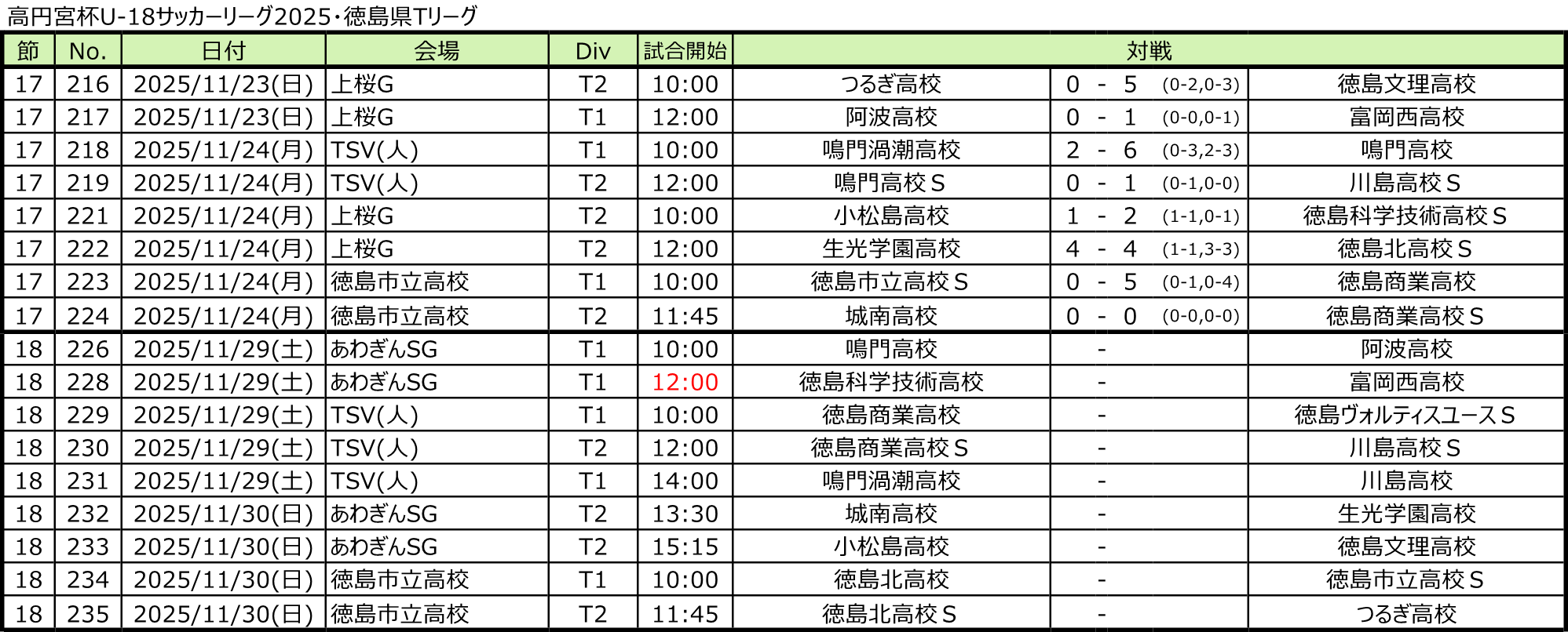 あわせて、11/29(土) 14:00 あわぎんSG会場 徳島科技 vs 富岡西 の試合が 12:00 キックオフに変更となりました。(11/18)